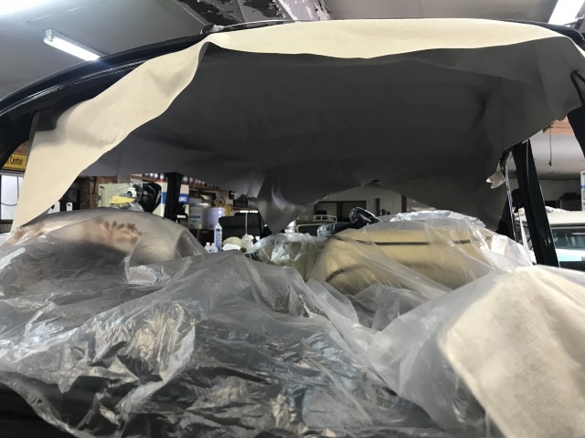 ルーフライニングの交換、フロント、リヤ、クォータースクリーンのウェザーストリップ、モールも交換します